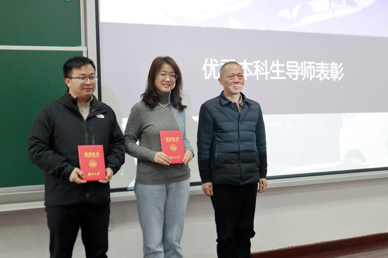 最后,学院对优秀本科生导师——陈坤秋、周蔚两位老师进行表彰,由我院党委书记宋杰老师颁发荣誉证书。作为优秀导师代表,陈坤秋老师寄语学生“用心体悟美好”,培养兴趣爱好,遇见美好、收获美好、成就美好;周蔚老师则鼓励学生不惧困难挑战,主动与世界建立联结。