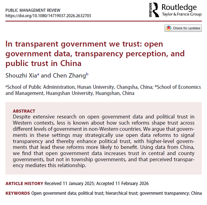 近日,我院教师夏守智(第一作者)与黄山学院经济管理学院张琛老师合作完成的论文“In transparent government we trust: open government data, transparency perception, and public trust in China”(《我们信赖透明政府:开放政府数据、透明度感知与公众信任》)在公共管理权威期刊《Public Management Review》在线发表。该刊是国际公共管理研究学会(IRSPM)的旗舰期刊,在公共管理与公共政策领域享有较高影响力。