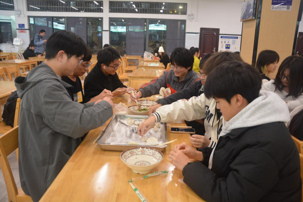 活动于冬至日下午拉开帷幕。食堂内气氛热烈,同学们围站在长桌旁,熟练地擀皮、填馅、捏合,手中诞生出月牙饺、元宝饺、麦穗饺等多种形态的饺子。现场还特别准备了包有红枣的“幸运饺”,寓意吉祥如意。大家一边品尝不同风味的饺子,一边用各地方言交流家乡习俗,欢声笑语与袅袅蒸汽交织,展现出融洽温暖的集体画面。