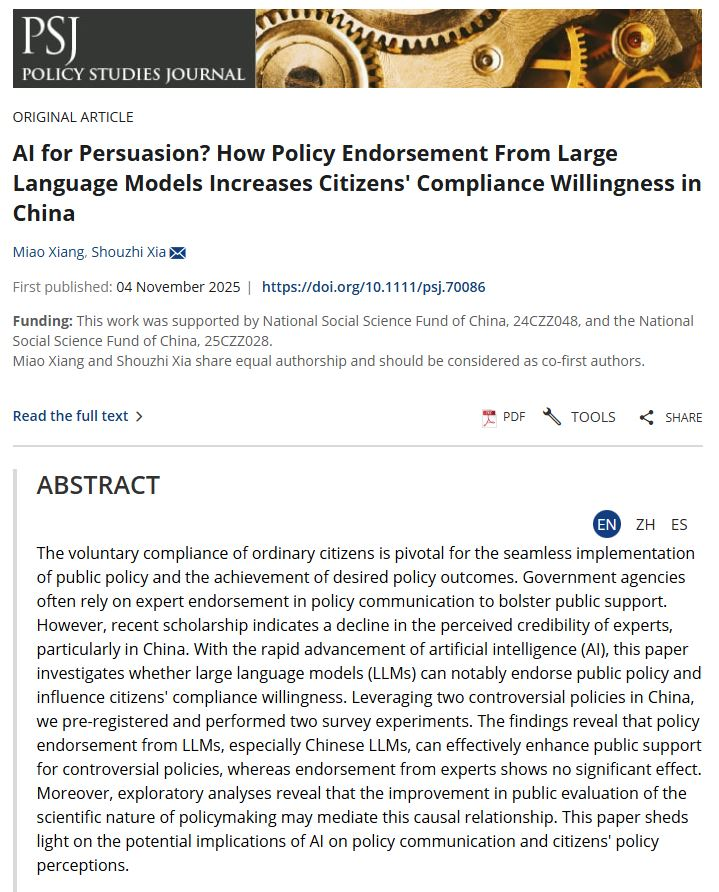 近日,我院教师夏守智(共同一作、通讯作者)与武汉大学政治与公共管理学院向淼老师合作的论文“AI for Persuasion? How Policy Endorsement From Large Language Models Increases Citizens’ Compliance Willingness in China”(《说服性人工智能?大语言模型的政策背书如何提升公众的政策遵从意愿》)于国际权威期刊Policy Studies Journal在线发表。Policy Studies Journal是美国政治学会(APSA)公共政策分会的旗舰期刊,是湖南大学校定A1类期刊,在政治学、公共政策与公共管理领域享有极高声誉。期刊2024年的影响因子为4.9,在48本公共管理类SSCI期刊中排名第5,在187本政治学SSCI期刊中排名第12。